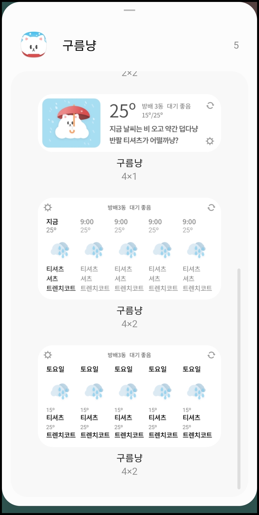 위젯 크기별로 5가지 종류가 있습니다. 2*2 크기 위젯 2개, 4*1 크기 위젯 1개, 4*2 크기 위젯 2개가 제공됩니다. 위젯으로 오늘의 날씨 뿐만 아니라 1주일간의 날씨도 한눈에 파악 가능하므로 날씨 위젯이 필요한 분들에게는 정말 필요로 하는 기능입니다. 이모티콘도 귀여워서 어떤 테마 환경을 쓰던 분위기와 잘 어울릴 거라 생각됩니다.