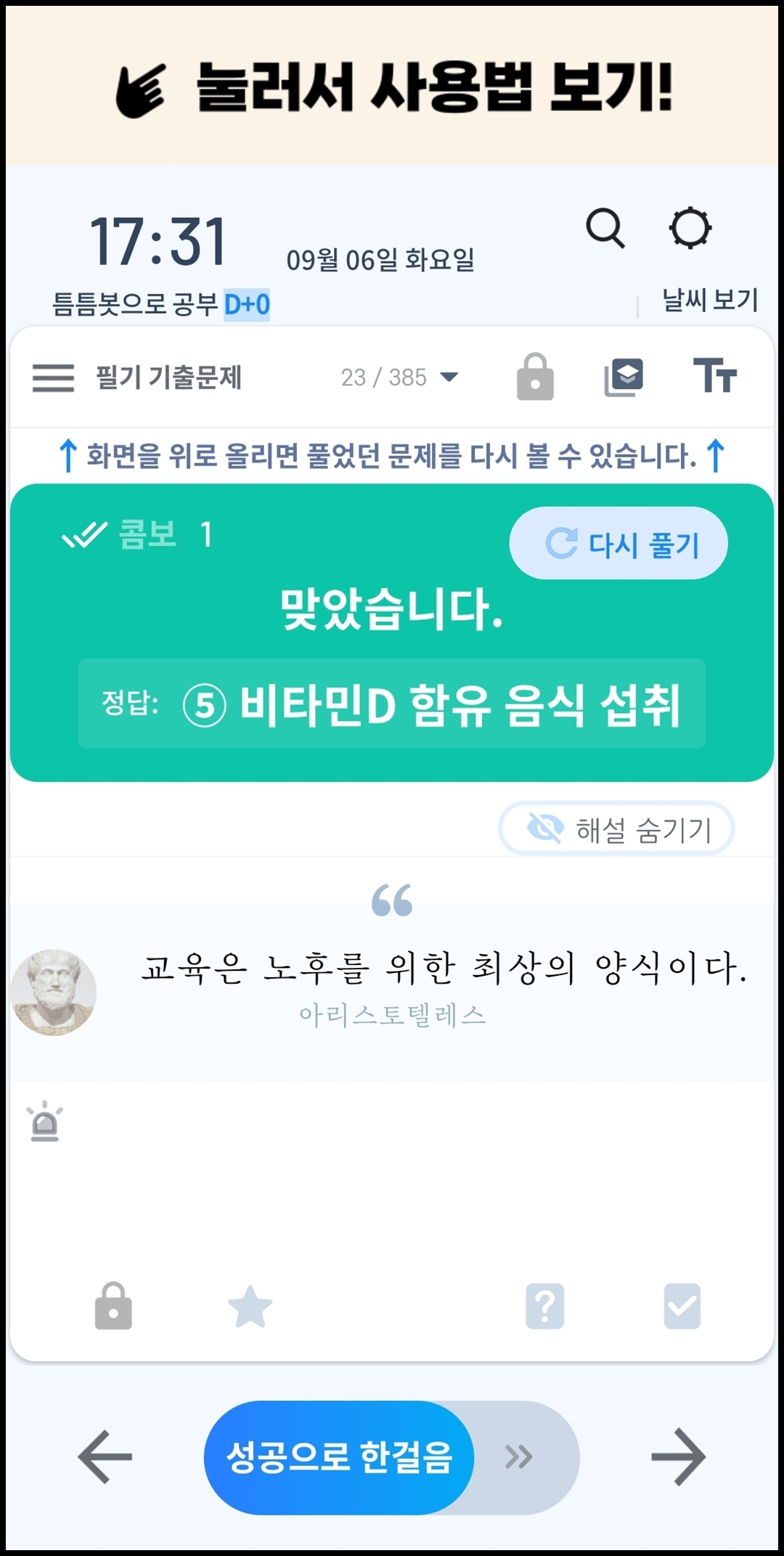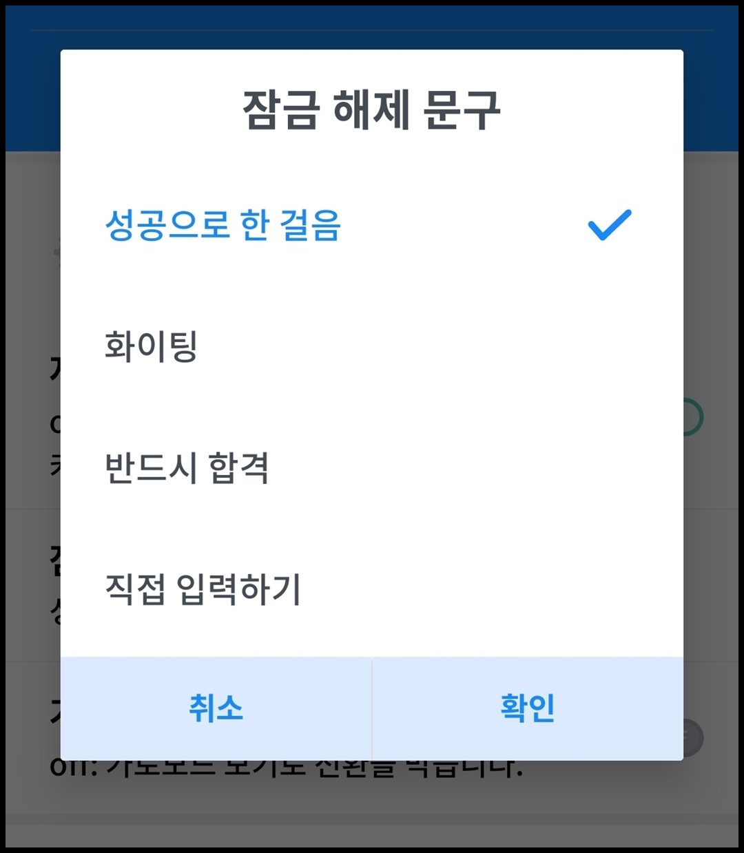 요양보호사 문제 풀기를 멈추고 싶다면 하단에 있는 '성공으로 한걸음'이라는 버튼을 누른 체 오른쪽으로 당기면 됩니다. 그러면 잠금화면이 풀리게 되면서 핸드폰 바탕화면이 표시됩니다.