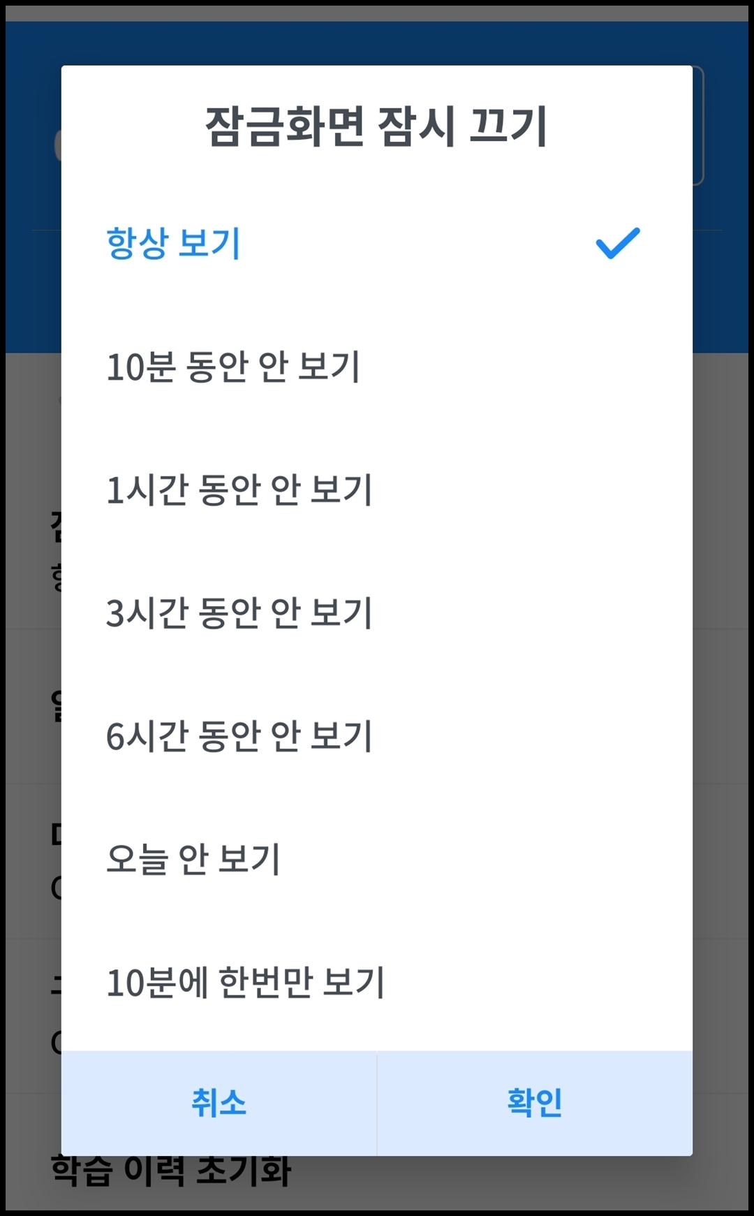 기타 설정에서는 잠금화면에서 요양보호사 기출문제를 얼마나 자주 볼 것인지 설정, 알람 시간에는 잠금화면 안보이기 설정, 백업하기, 초기화 설정 등을 제공하고 있습니다.